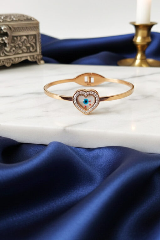 The centerpiece is a beautifully crafted heart, featuring a luminous mother-of-pearl inlay and a sparkling pavé crystal border. Nestled at its center is a striking blue evil eye, offering a symbolic touch of protection. This elegant design is set on a sleek, polished bangle with a secure hinge clasp for easy wear. It’s a chic and meaningful accessory, perfect for adding a sophisticated touch to any outfit, whether worn solo as a statement piece or stacked with other favorites.