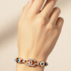 Elevate your wristwear with this stunning and luxurious bracelet. Crafted with a beautiful rose gold finish, the design centers around a captivating interlocking motif fully embellished with shimmering micro-pave crystals.Flanking the centerpiece are multiple vibrant Evil Eye charms, each featuring a clear blue iris. This powerful symbol of protection against negative energy adds meaningful charm to the highly fashionable design. The elegant link construction ensures the bracelet lays beautifully on the wrist, as shown, and offers comfortable, reliable wear.