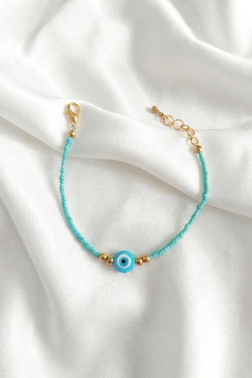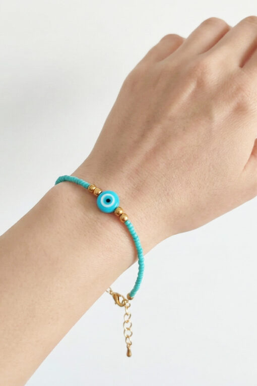 Tags: beach style bracelet, bohemian accessory, boho bracelet, calming turquoise bracelet, delicate bead bracelet, everyday wear bracelet, evil eye charm jewelry, evil eye fashion, evil eye protection jewelry, good luck charm bracelet, handmade style jewelry, minimalist bead bracelet, seed bead bracelet, spiritual protection bracelet, summer jewelry, trendy beaded bracelet, turquoise bead bracelet, Turquoise Evil Eye Bracelet, turquoise jewelry, women’s fashion bracelet