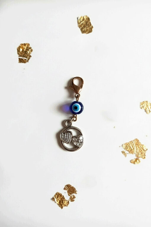 The design features a lower silver-toned pendant showcasing two interlocking hearts, beautifully accented with shimmering micro-pave crystals to symbolize unity and enduring affection. The charm hangs beneath a classic deep blue glass Evil Eye bead, a powerful and traditional talisman renowned globally for bringing good luck and safeguarding against negative energy. This accessory elegantly blends romantic symbolism with spiritual protection. The durable silver-toned lobster clasp allows you to easily attach this piece to bracelets, necklaces, keychains, zippers, or planner rings. This beautiful, versatile accessory makes a deeply thoughtful gift, symbolizing protection over love, and adding a touch of sparkling sophistication to any item.