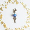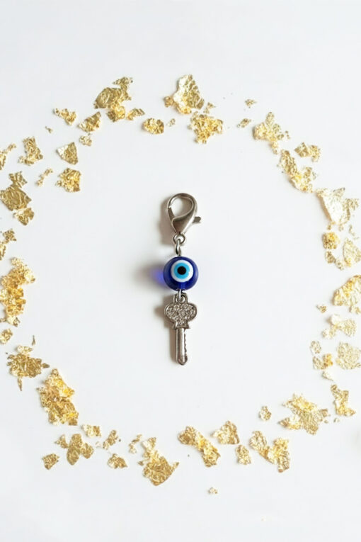 The centerpiece is a small, classic blue and white Evil Eye bead, a globally recognized talisman believed to bring good luck and safeguard against negative energy. Suspended beneath the Evil Eye is a charming vintage key pendant, beautifully detailed with shimmering micro-pave crystals on its head. The key symbolizes opportunity, freedom, and unlocking potential, creating a powerful combination with the protective Evil Eye. The charm hangs from a durable silver-toned lobster clasp, making it incredibly versatile; easily attach it to your purse zipper, keyring, backpack, planner, or jewelry chain. This durable and meaningful piece is an ideal, thoughtful gift that blends timeless symbolism with a touch of dazzling, portable elegance.