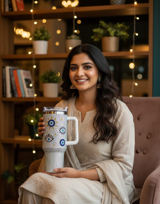The detailed Evil Eye and Sun design adds a mystical charm, believed to ward off negativity while elevating your daily routine. Made with high-grade stainless steel, it’s durable, temperature-retaining, and built to last. With a convenient handle and spill-proof lid, this tumbler perfectly balances luxury, function, and craftsmanship — an exquisite gift or personal indulgence. 💎🧿✨
