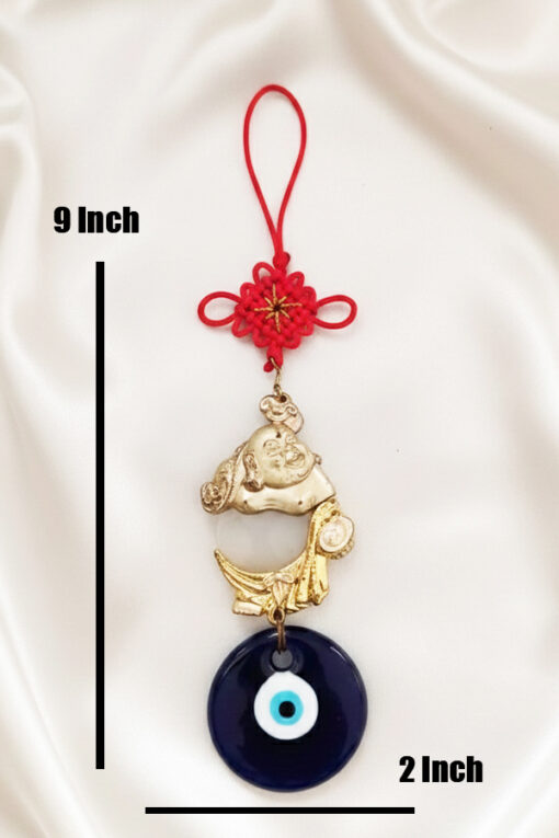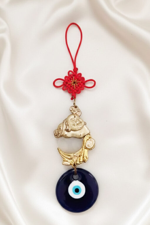 Bring layered luck, prosperity, and powerful protection to your space with this unique ornamental hanging. The piece features a traditional red Chinese knot (symbolizing good luck and longevity) at the top. It cascades down to a gold-toned Fortune Charm, which depicts the Laughing Buddha (or Chinese God of Wealth) resting on a moon or gold ingot, signifying abundance. Anchoring the piece is a classic deep blue glass Evil Eye medallion (Nazar), renowned globally for warding off negative energy. This meaningful combination of Eastern and Mediterranean talismans is designed to attract wealth, happiness, and safety.