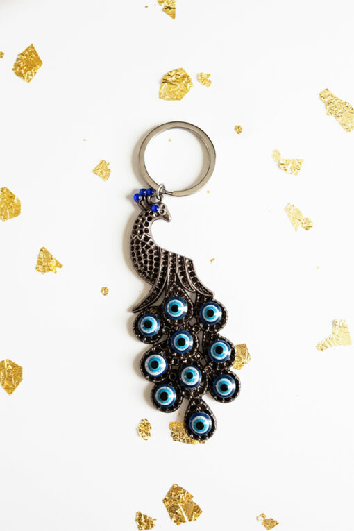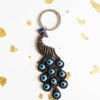 Striking Peacock Evil Eye Charm Keychain in Dark Silver Tone