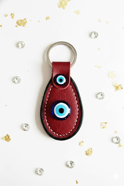 Carry powerful protection and bold style with this unique leather keychain. The design features a distinctive, oval-shaped piece of rich red leather, accented with contrasting white stitching for a handmade, sophisticated aesthetic. This ancient and globally recognized talisman is believed to bring good luck and safeguard against negative energy. A smaller Evil Eye bead is also attached to the keyring strap, doubling the protective charm. The durable metal split ring ensures easy and secure attachment to your keys, bag, or backpack. This eye-catching accessory is an ideal gift, perfectly blending durable, unique materials with powerful, protective symbolism for everyday use.