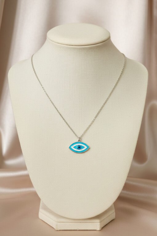 The delicate chain beautifully showcases the unique, horizontally elongated pendant. The centerpiece is a bold Evil Eye charm rendered in smooth, brilliant aqua blue and white enamel, creating a fresh, contemporary twist on the classic protective symbol. The eye itself features a sharp, bright blue iris, making it an instant focal point. As a globally recognized symbol, the Evil Eye is believed to offer powerful protection and good fortune to the wearer. Its elegant shape and beautiful color palette make it an ideal accessory for everyday wear, effortlessly adding a touch of sophisticated style and meaningful symbolism to any ensemble.