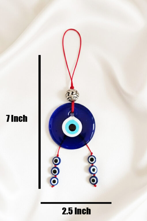 The centerpiece is a substantial, polished deep blue glass Evil Eye medallion, the globally recognized talisman revered for its power to ward off negative energy and attract good fortune. The medallion is suspended by a striking red woven cord, which symbolizes good luck and is accented with a detailed silver-toned metal bead. Dangling from the bottom are two strands of miniature Evil Eye beads, enhancing the charm’s protective power and adding playful movement. This meaningful piece serves as both a stylish decorative accent and a potent amulet. It is perfect for hanging near an entrance, in a window, or in a car, making it an ideal, thoughtful gift for housewarmings or anyone seeking to infuse their environment with safety and charm.