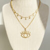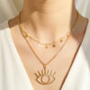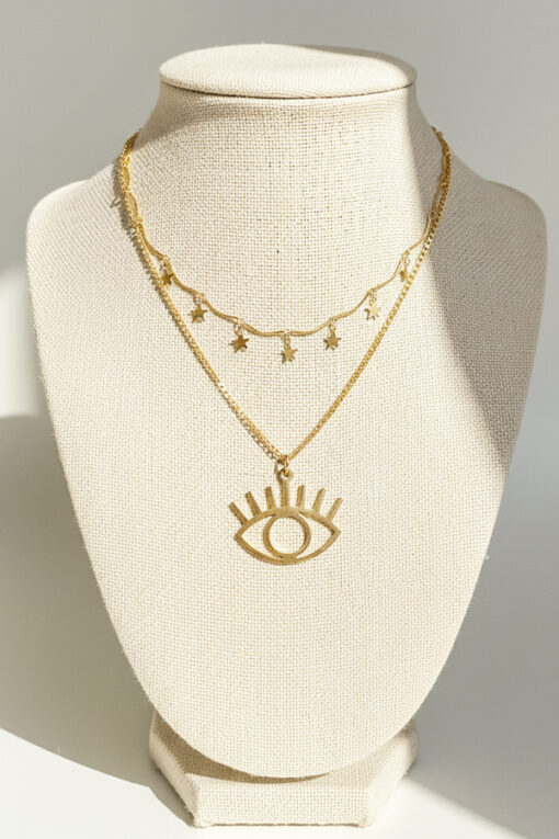 Define your look with this chic and effortlessly layered gold necklace. This single piece creates the perfect stacked style, featuring two delicate, distinct gold chains. The upper layer is a dainty chain adorned with a row of sweet miniature star charms, adding a playful, celestial touch. The lower layer showcases a bold, oversized Evil Eye pendant with an intricate, cut-out design that features long, sweeping lashes. This powerful symbol of protection and good fortune anchors the stylish look. Perfect for those who love trendy, meaningful accessories, this durable necklace is ideal for elevating any outfit. Skip the hassle of layering and instantly achieve a fashion-forward, luxurious style with this unique two-in-one piece.