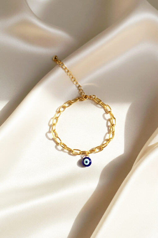 The piece features a trendy, chunky oval link design, giving it a high-fashion, polished look that is both substantial and comfortable to wear. Suspended gracefully from the chain is a small, classic Evil Eye bead charm, rendered in smooth blue and white enamel. This timeless motif is renowned globally for providing powerful protection and attracting good fortune. The bracelet is fully adjustable with a delicate extender chain and clasp, ensuring a comfortable and secure fit. This durable and fashionable accessory is perfect for those who love to blend contemporary style with meaningful symbolism. Wear it alone as a statement or effortlessly layer it with other bracelets for a bolder look.