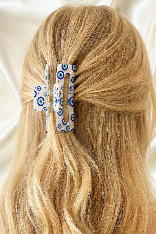 Elevate your everyday hairstyle with a touch of mystical charm and modern flair using this chic Evil Eye hair claw clip. Crafted from high-quality, durable cellulose acetate, the clip features a lustrous pearlescent white finish that has a beautiful, marble-like depth. This iconic symbol is not only a major fashion trend but also a traditional talisman for protection against negative energy and bad vibes. Designed with a sturdy spring and smooth, interlocking teeth, this large rectangular claw offers a strong, non-slip grip, making it perfect for securing thick hair, creating effortless French twists, or managing a stylish half-up look. Whether you are dressing up for a brunch or keeping it casual for errands, this accessory adds a pop of color and personality to your ensemble. It is the perfect gift for the fashion-forward individual who loves blending Y2K aesthetics with meaningful symbolism.