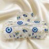 The design is covered in a playful yet sophisticated repeating pattern of vibrant blue Evil Eye motifs, accented with delicate starburst details.