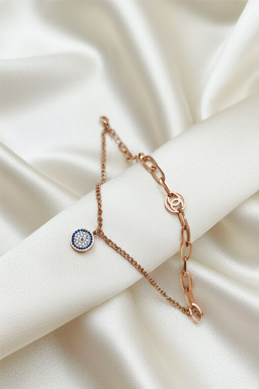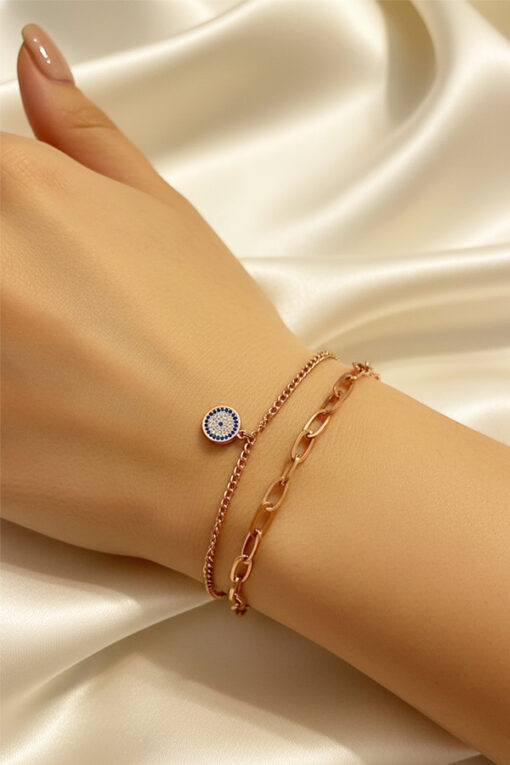 Crafted in a warm, polished rose gold tone, this single piece eliminates the hassle of stacking by perfectly combining two distinct chains for a high-fashion look. The design features a delicate, fine chain layered with a trendy chunky paperclip chain. Dangling gracefully from the thinner chain is a miniature Evil Eye medallion with a vibrant blue iris, serving as a powerful and classic symbol of protection and good fortune. The comfortable, secure design makes it ideal for everyday wear, adding a touch of modern luxury to any outfit. This durable, stylish bracelet is an essential accessory for those who appreciate contemporary elegance and meaningful, worry-free jewelry.