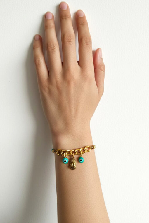Achieve perfect spiritual balance with this intricate Buddha & Evil Eye Charm Bracelet.
