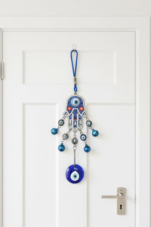 Striking Blue Enamel Hamsa Hand Wall Hanging with Evil Eye Protection