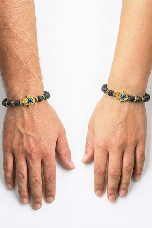 Designed to be worn by anyone, this piece combines the grounding power of earth elements with ancient symbols of protection, making it a perfect accessory for couples or spiritual seekers. The bracelet is strung with genuine Black Lava Stone beads, instantly recognizable by their natural, porous texture. These stones are not only stylish but are often used in aromatherapy as they can hold and diffuse essential oils. The focal point is a beautifully detailed Gold-Toned Hamsa Hand charm, a universal sign of protection, strength, and blessings. Resting in the palm of the hand is a vibrant Blue Evil Eye, adding an extra layer of defense against negative vibes. Accented with gold spacer beads for a touch of elegance, this bracelet features a durable stretch cord design, ensuring a comfortable fit for both men’s and women’s wrists. Whether worn as a matching couple’s set or a personal talisman, it blends rugged natural texture with spiritual grace.