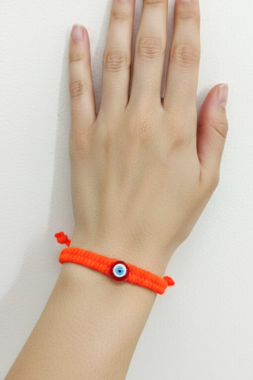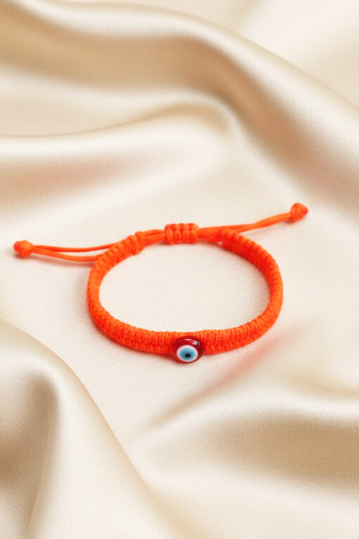 This eye-catching accessory is designed to be a bold, yet comfortable, daily talisman. The main band features a durable orange cord meticulously woven using the macramé technique, giving it a soft yet substantial texture. The bright orange hue is associated with creativity, enthusiasm, and warmth, making it a powerful color choice for an uplifting accessory. At the center of the braid is a petite, translucent red-orange Evil Eye bead. The traditional protective eye is believed to guard the wearer against negative energy and envy, while the vibrant color adds a cheerful aesthetic. The bracelet is completed with a practical sliding knot closure, which allows for full adjustability and ensures a perfect, custom fit for almost any wrist size. Its sturdy construction means it can be worn day in and day out, on its own as a statement piece or stacked with other colorful thread bracelets for a festival-ready look.
