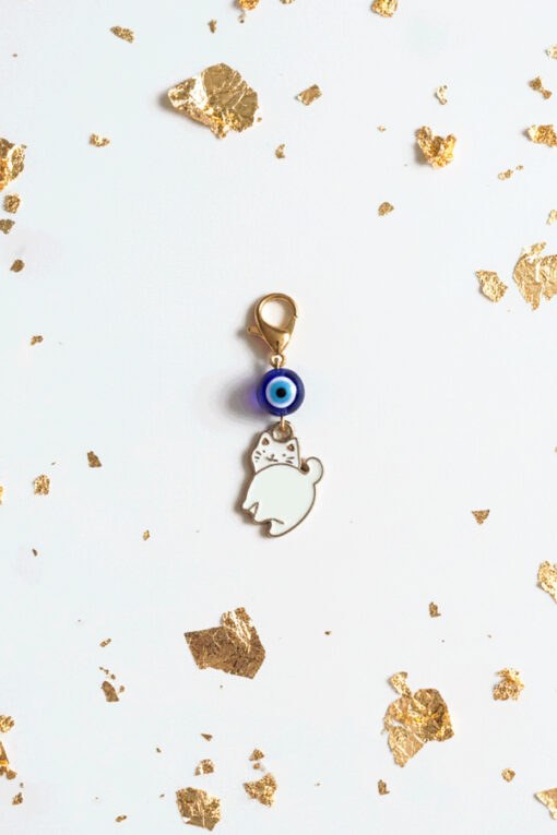 The centerpiece is a cute, enameled white cat charm, featuring subtle details and a whimsical, cartoon-like posture that is sure to bring a smile. Suspended just above the cat is a classic blue and white Evil Eye bead, a powerful and traditional talisman believed to bring good luck and safeguard against negative energy. The charm hangs from a small, durable gold-toned lobster clasp, making it incredibly versatile; easily attach it to your purse zipper, keyring, backpack, planner, or jewelry chain. This durable and playful piece is an ideal, thoughtful gift for cat lovers and anyone who appreciates a blend of sweet design and meaningful, protective symbolism.