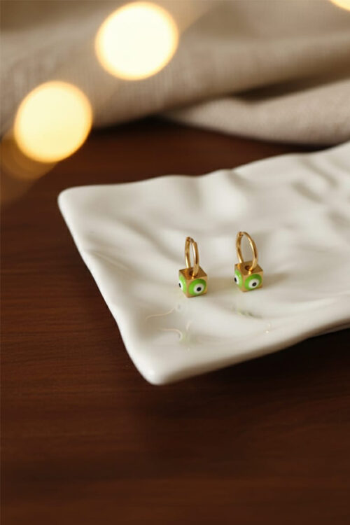 Green Cube Evil Eye Hoop Earrings – Modern Minimalist Protection Charm