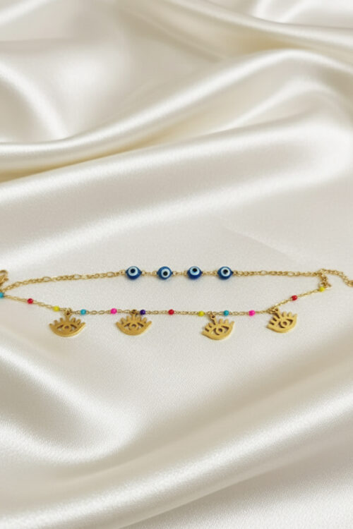 Delicate Anti-Tarnish Gold Double-Chain Flower & Evil Eye Bracelet